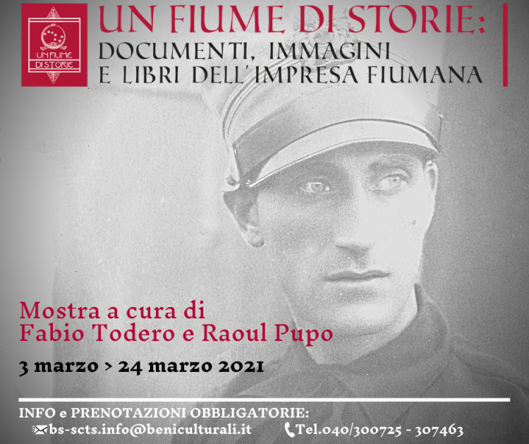 Con il passaggio in “zona gialla” della regione Friuli Venezia Giulia, riapre la mostra bibliografico-documentaria Un Fiume di Storie: documenti, immagini e libri dell’impresa fiumana, curata da Fabio Todero e Raoul Pupo e promossa dalla Biblioteca statale Stelio Crise di Trieste e dall’Istituto regionale per la storia della Resistenza e dell’Età contemporanea nel Friuli Venezia Giulia, con la collaborazione della Società di Studi Fiumani e dell’Archivio di Stato di Trieste, ed è patrocinata dal Comune di Trieste.